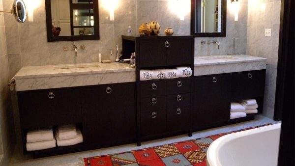 Handcrafted double bathroom vanity designed with fine wood cabinetry, marble surfaces, and timeless symmetry.